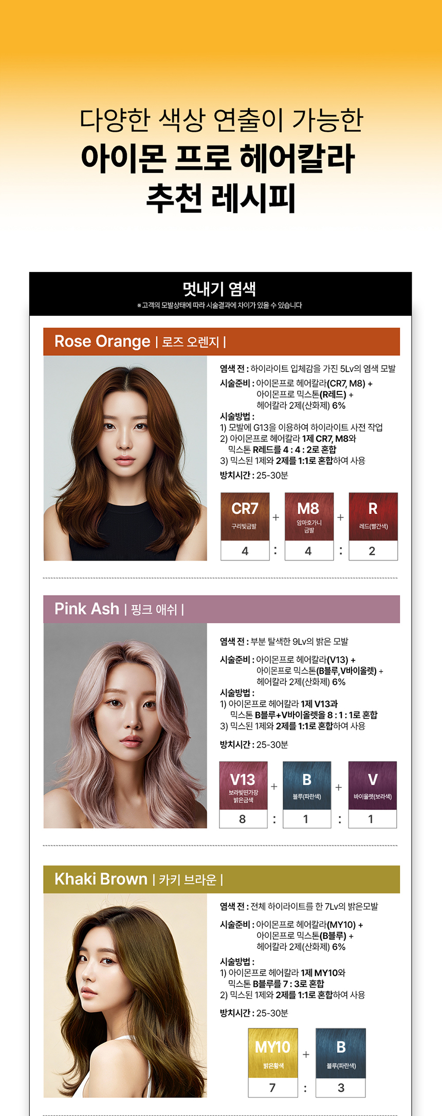 제품의 사용목적/방법 ◎자연모 염색 -아이몬프로 헤어칼라 혼합액을 모발에 뿌리에서 끝부분까지 도포합니다. -얼룩이 생기지 않도록 모발 전체에 혼합액을 균일하게 펴 바릅니다. -모발에 열을 가하지 않고 30분간 자연방치한 후 미온수로 혼합액을 잘 씻어냅니다. ◎염색및 펌모발 -아이몬프로 헤어칼라 혼합액을 새로 자라난 모발의 뿌리 부분에 바르고 15분 가량 펴 바릅니다. -나머지 모발 부분에 얼룩이 생기지 않도록 균일하게 바르고 10분 가량 자연방치한후 미온수로 혼합액을 잘 씻어냅니다.