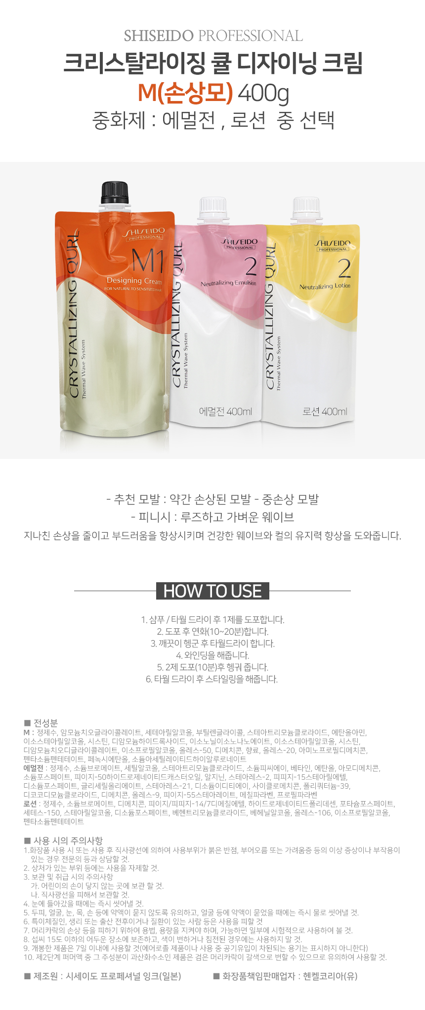 | 제품의 사용목적/방법 | 1. 샴푸 후 타월 드라이. 2. 컬 크리에이터 1제 도포 후 연화 (10~20분) 3. 행굼 후 타월 드라이. 4. 와인딩. 5. 컬 크리에이터 2제 도포 (10분) 6. 헹굼 후 타월드라이. |